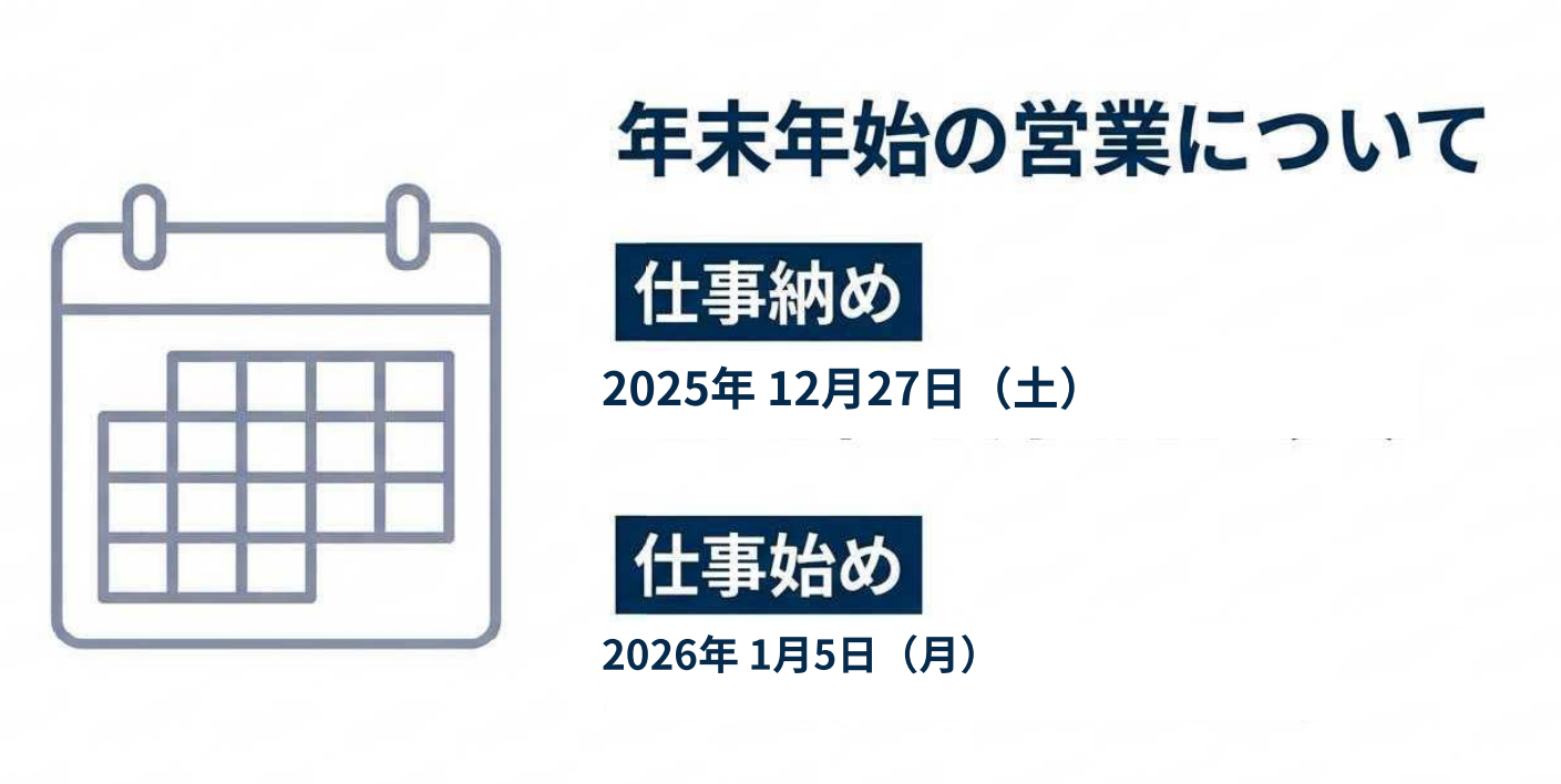 年内の最終営業日(仕事納め)および年始の営業開始日(仕事始め)は以下の通りです。